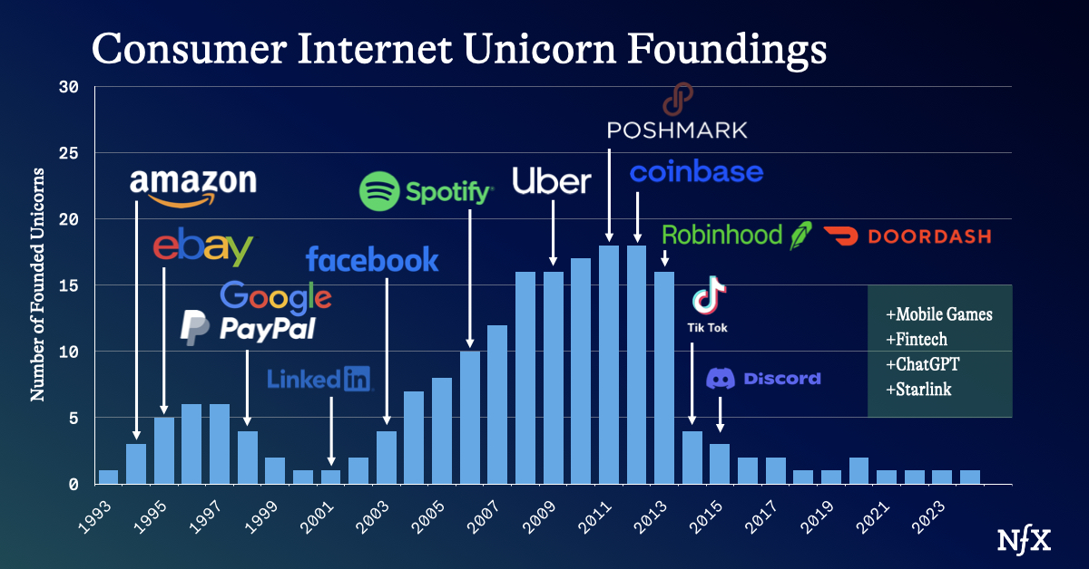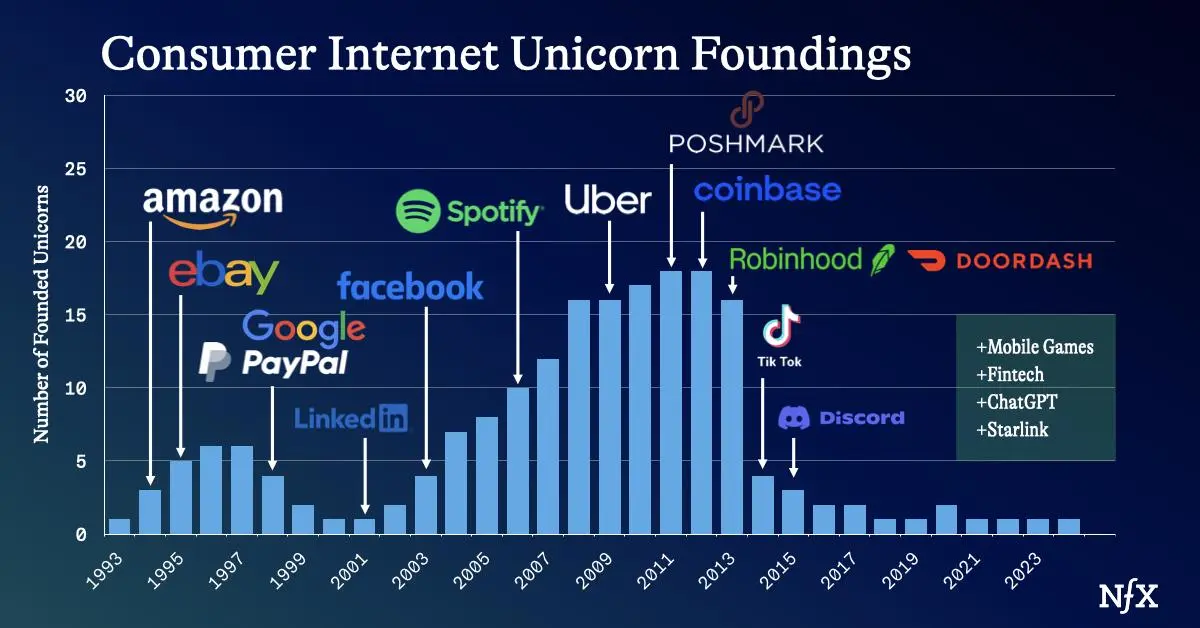 - 2014년~ : 컨슈머 소프트웨어 스타트업을 위한 기술의 창은 90% 닫혔습니다. 지난 11년간 서구권에서 등장한 컨슈머 소프트웨어 유니콘은 디스코드, 틱톡 그리고 몇몇 게임, 핀테크, 리워드앱 뿐이었습니다.