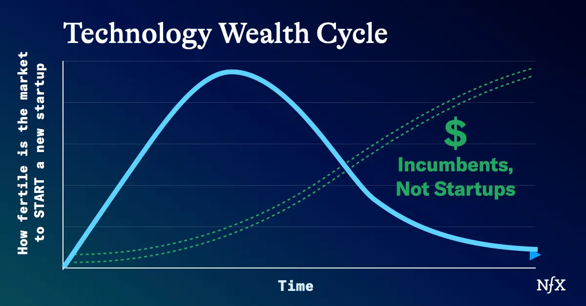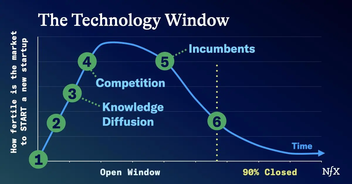 사람들이 이야기하지 않지만, 서구권에서 컨슈머 스타트업에 대한 투자는 11년동안 사실상 끝난 상태입니다. 그 이유는 기술의 창(Technology window)이 90% 수준으로 닫힌 상태였기 때문입니다.